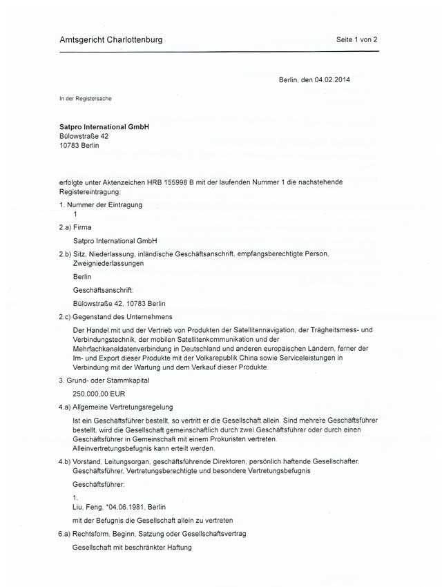 2014年2月4日德国柏林,SATPRO INTERNATIONAL正式注册成功,标志着星展测控在国际化道路上迈出了关键性一步。